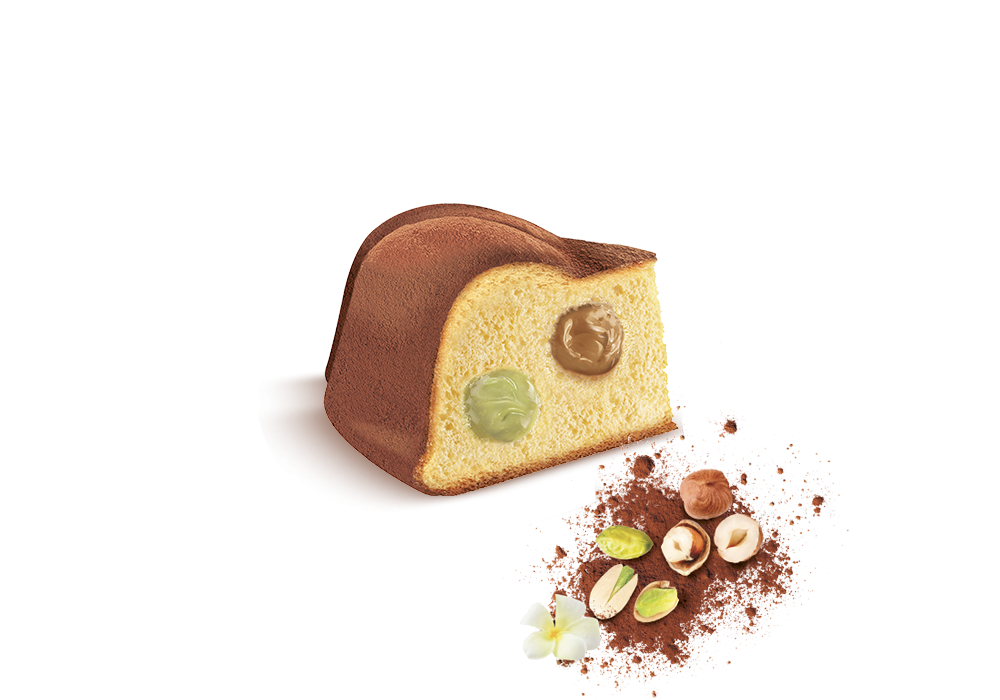лек сладкиш с вътрешен мек кремообразен пълнеж от кремове от шамфъстък и италиански лешници и поръсен със снежнобяла пудра захар. Приготвен в най-добрите традиции с натурални продукти. От кокошки от свободно отглеждане.